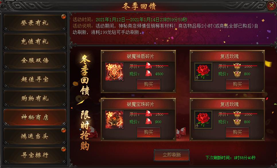 活动六:神秘商店 活动时间:1月12日00:00:00 -1月14日23:59:59 活动说明 : 活动期间,神秘商店倾情促销稀有材料!商店物品每2小时自动刷新(或全商品全部已购后),消耗199龙钻可手动刷新。