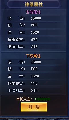 神器升阶仅需消耗元宝 提升神器等阶,可提神器固定伤害及石化概率 提升神器等阶,人物可获得永久属性加成