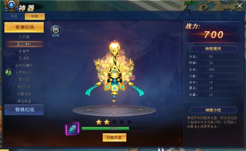 升阶,就送新神器 酷炫神器幻化,解锁即可随意切换 神器幻化都可升星,获得永久人物属性加成 |