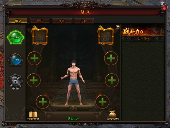开启:玩家转生等级为8转、开服第15天。 作用:在32-40阶武器及衣服上进行符文的镶嵌、合成、洗练及分解。 可为玩家提供大量战斗力。 获得:符文可在冰宫幻境、雷霆宝藏中获得。
