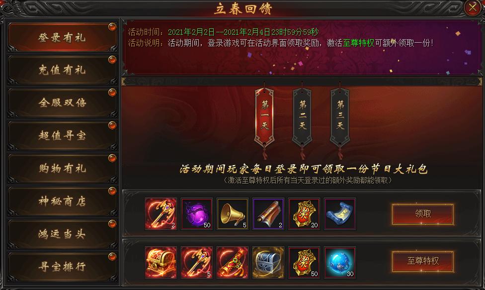 活动时间:2月2日00:00:00-2月4日23:59:59 活动一:登录有礼 活动时间:2月2日00:00:00 -2月4日23:59:59 活动说明:活动期间,每日登录游戏可领取奖励,激活至尊特权可额外领取一份!