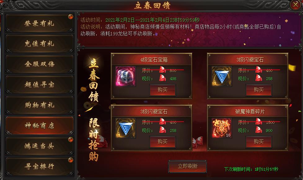 活动六:神秘商店 活动时间:2月2日00:00:00 -2月4日23:59:59 活动说明 : 活动期间,神秘商店倾情促销稀有材料!商店物品每2小时自动刷新(或全商品全部已购后),消耗199龙钻可手动刷新。