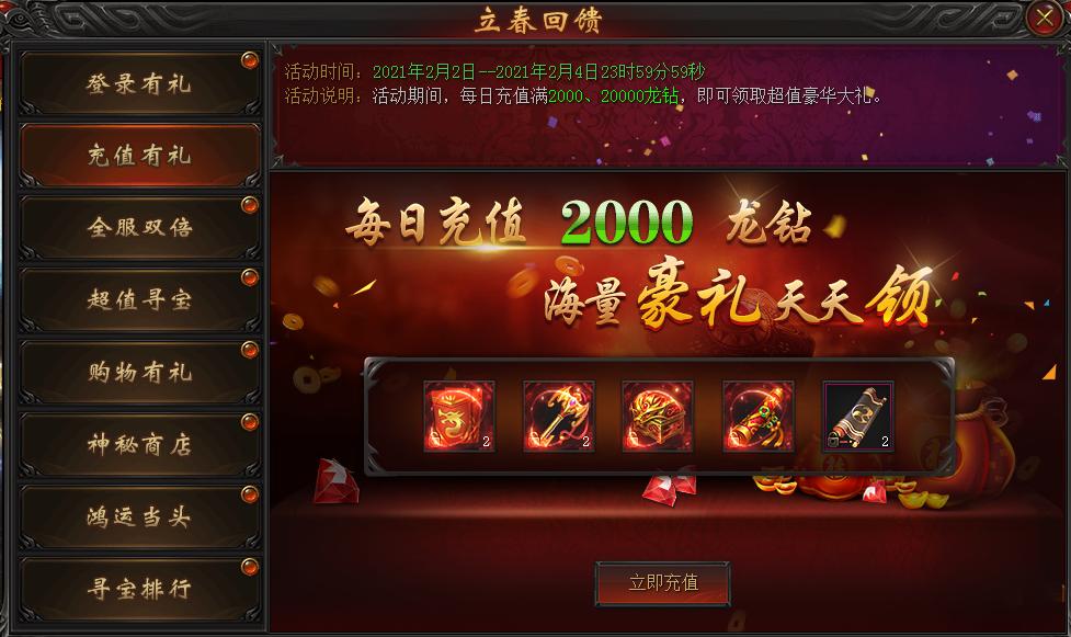 活动二:充值有礼 活动时间:2月2日00:00:00 -2月4日23:59:59 活动说明:活动期间,每日充值满2000、20000龙钻!还能领取超值豪华大礼