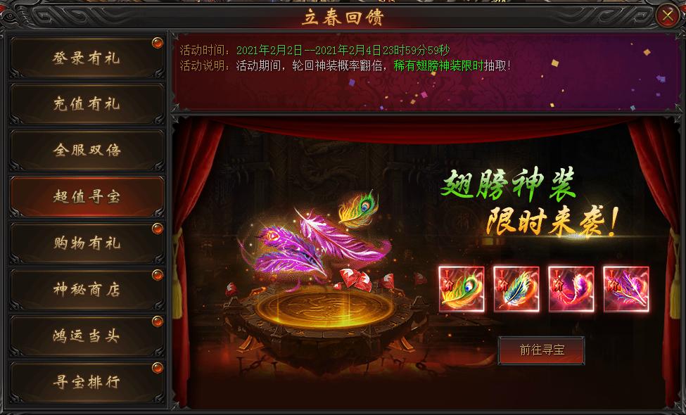活动四:超值寻宝 活动时间:2月2日00:00:00 -2月4日23:59:59 活动说明:活动期间,轮回神装概率翻倍,翅膀神装限时抽取!