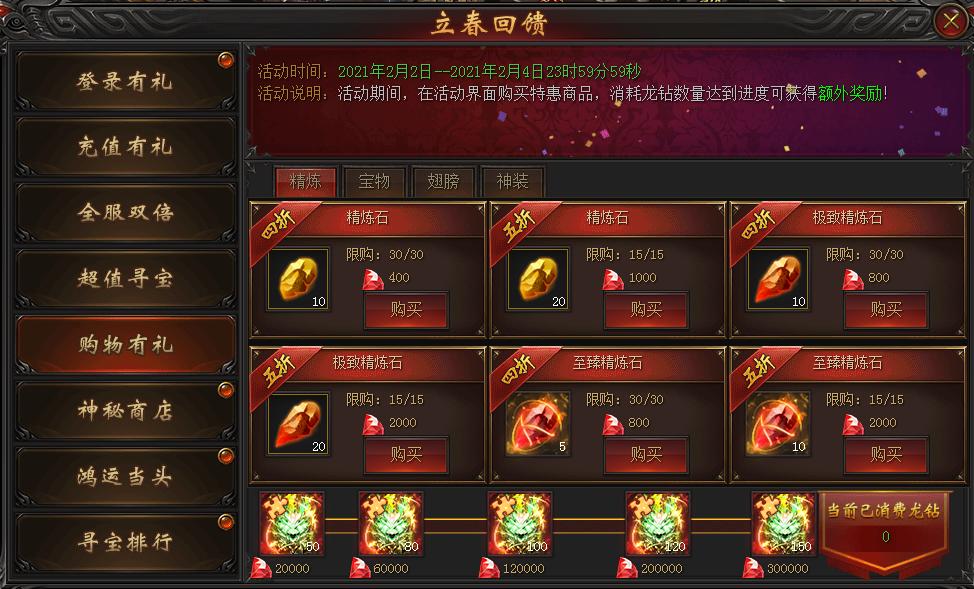活动五:购物有礼 活动时间:2月2日00:00:00 -2月4日23:59:59 活动说明:活动期间,在活动界面购买特惠商品,消耗龙钻数量达到进度可获得额外奖励!