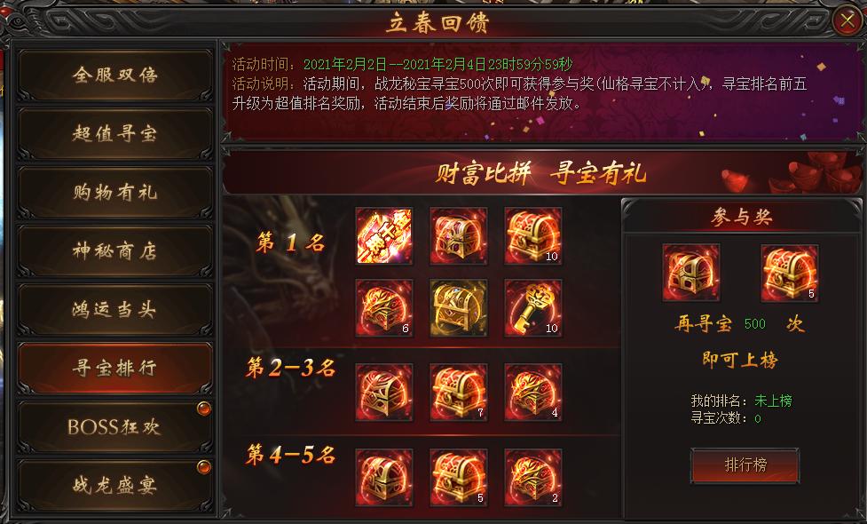 活动八:寻宝排行 活动时间:2月2日00:00:00 -2月4日23:59:59 活动说明:活动期间,战龙秘宝寻宝500次即可获得参与奖,寻宝排名前五升级为超值排名奖励,活动结束后奖励将通过邮件发放。