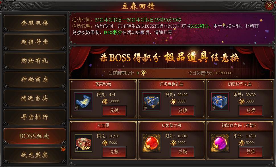 活动九:BOSS狂欢 活动时间:2月2日00:00:00 -2月4日23:59:59 活动说明 : 活动期间内,击杀BOSS获得“boss积分”,“boss积分”可用于兑换材料,每种材料均有兑换次数限制,“boss积分”在活动结束后,清除归零