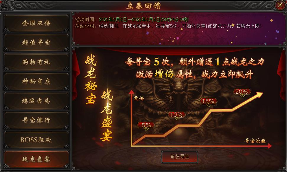 活动十:战龙盛宴 活动时间:2月2日00:00:00 -2月4日23:59:59 活动说明:活动期间,在战龙秘宝中,每寻宝5次,可额外获得1点战龙之力,获取无上限!