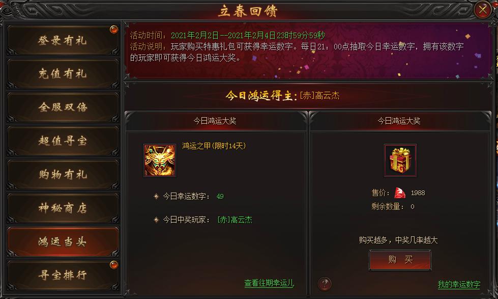 活动七:鸿运当头 活动时间:2月2日00:00:00 -2月4日23:59:59 活动说明 : 玩家每消耗1988龙钻即可获得一个1-100之间的幸运数字。每日21点抽取今日幸运数字,拥有该数字的玩家即可获得今日鸿运大奖。