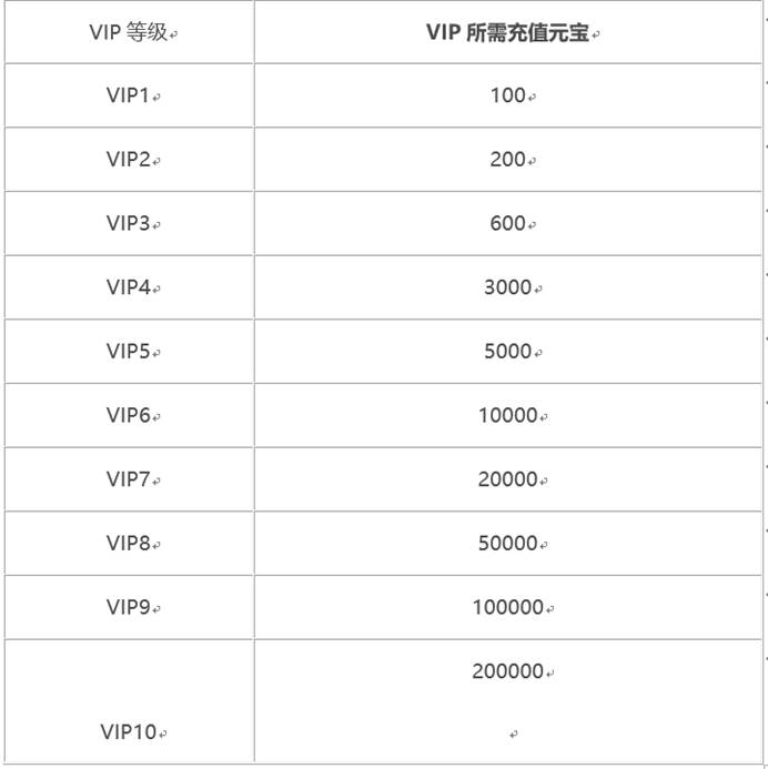 1、VIP共有10级,充值比例为1:10。