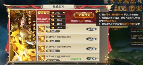 活动介绍:活动期间,消耗一定元宝,购买投资返利,购买投资金元宝越高,收获返利越高。