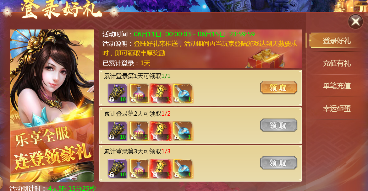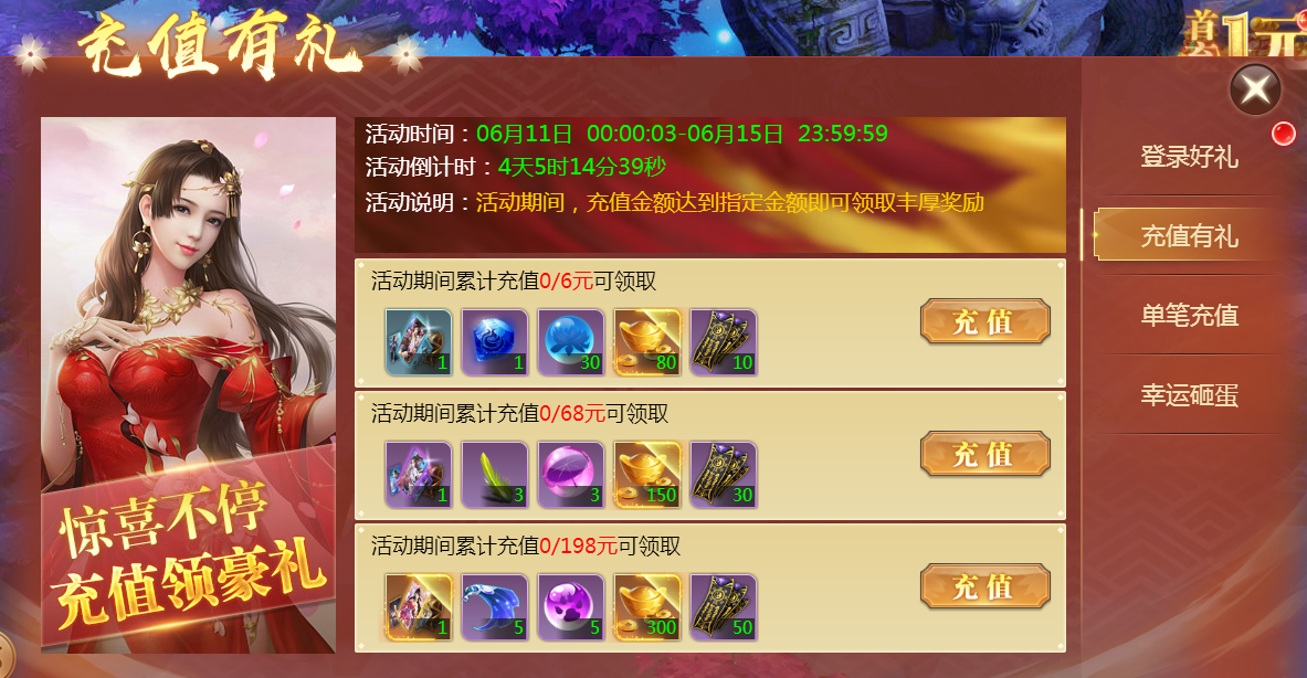 二、充值有礼 【活动时间】:6月18日-6月20日 充值返大礼,活动有惊喜!活动期间,累计充值达到指定额度,便可获得丰厚奖励!