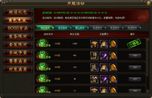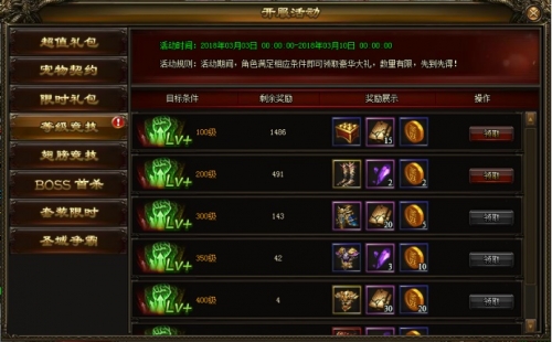 【活动内容】 ①活动期间内,玩家达到指定等级可免费领取豪华大礼,数量有限,先到先得! ②具体领取条件