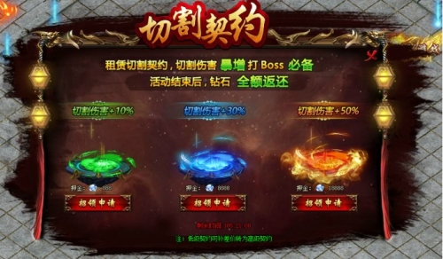 【活动内容】 活动期间内玩家可花费少量钻石购买丰厚礼包,礼包可快速提升装备等级、翅膀阶数,更有海量元宝任性使用。 2.切割契约 【活动界面】