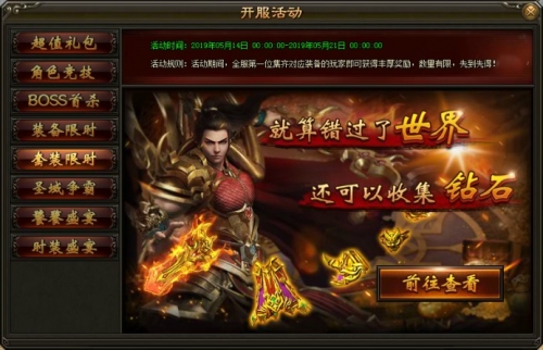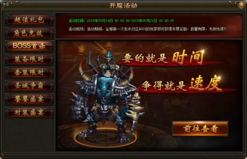 【活动内容】 活动期间内,全服第一次击杀对应BOSS的玩家即可免费领取丰厚奖励,数量有限,先到先得! 6.装备限时 【活动界面】