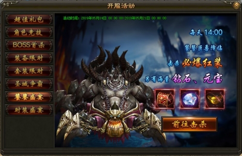 【活动内容】 开服前七天,每天14:00饕餮巨兽降临,击杀必爆红装,另有海量钻石元宝爆出。 10.时装盛宴 【活动界面】
