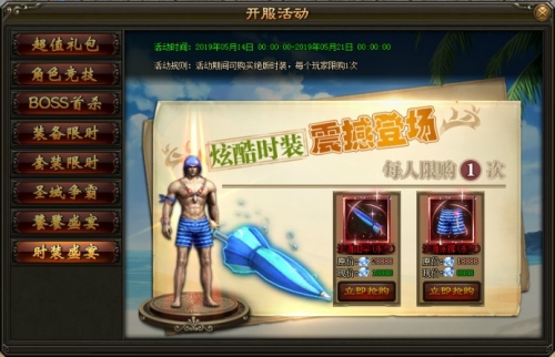 【活动内容】 开服前七天可购买炫酷绝版时装,每个玩家限购一次