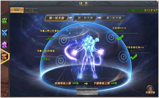 ④ 每个境界都有一个等级上限,达上限后不能获取经验升级人物等级,升境后可继续升级