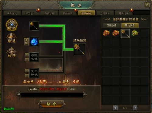 (5)融合时,放入巧匠之锤可提升融合成功率(可提升至100%),放入天工神铁可提升大成率(最多额外提升20%的几率)
