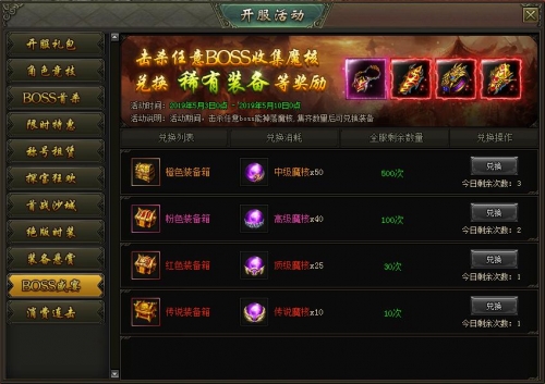活动内容:活动期间,击杀BOSS可掉落魔核,收集不同的魔核可兑换极品装备箱奖励,全服限量兑换,赶快击杀BOSS吧!