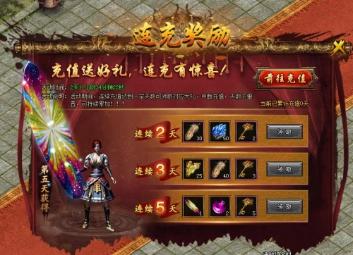 活动内容:活动期间,每天充值2000钻石,累计充值天数达到2天、3天、5天即可领取超值奖励!