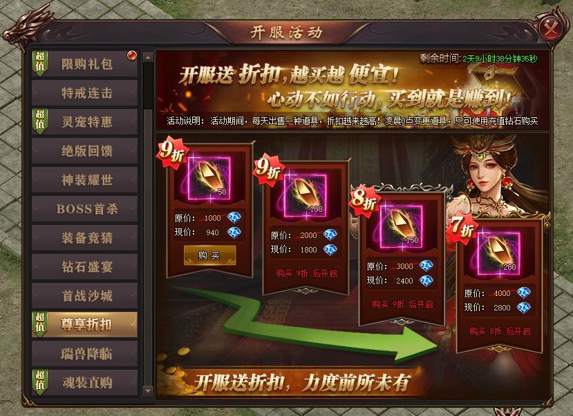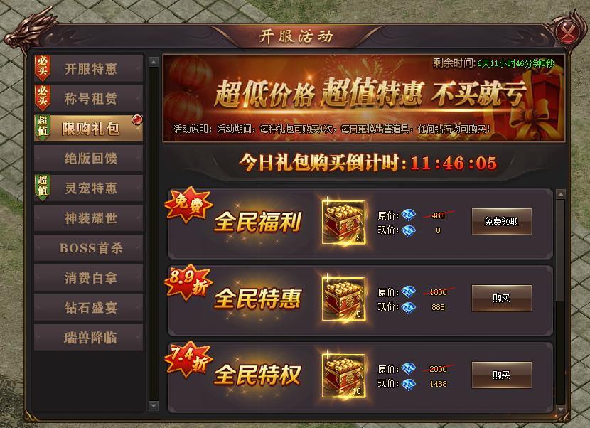活动说明:活动期间,可限量购买折扣礼包,达到指定特权等级可购买更加超值专属折扣礼包,机会只限当天,开服冲榜必备!