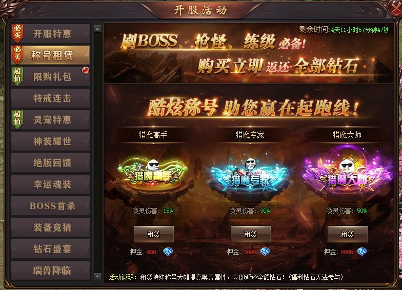 活动说明:活动期间,租赁限时炫酷称号,唤灵伤害瞬间飙升,并且购买后立即返还全部钻石