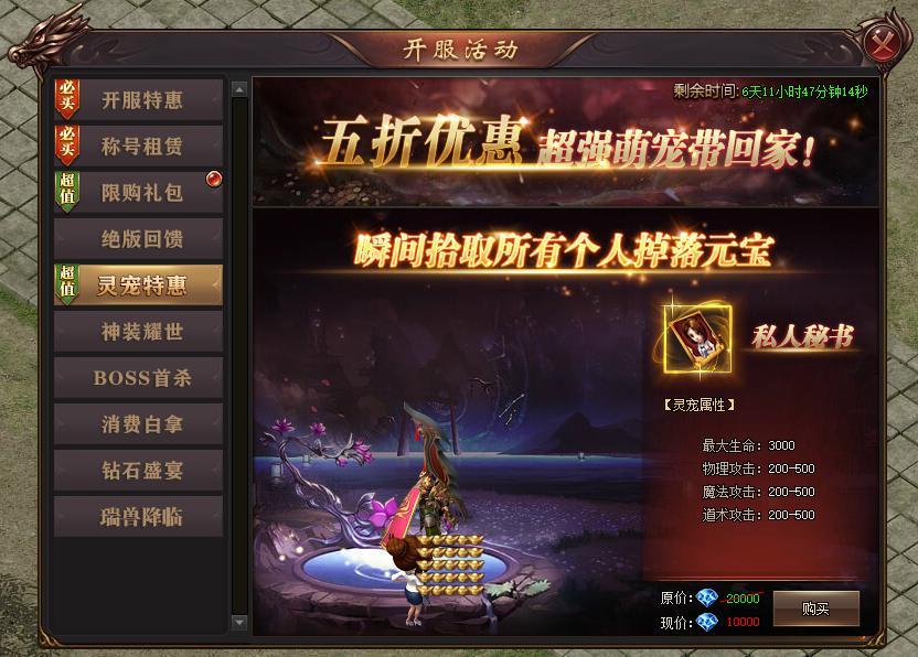 活动说明:活动期间,可5折购买超强灵宠“私人秘书”,瞬间拾取所有个人掉落元宝,解放你的双手!