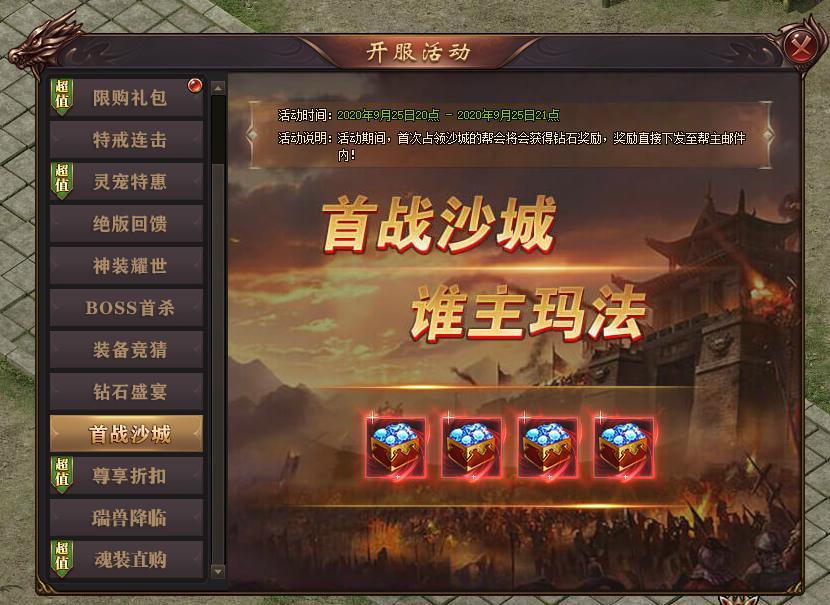 活动说明:活动期间,首次占领沙城的帮会将会获得钻石奖励!
