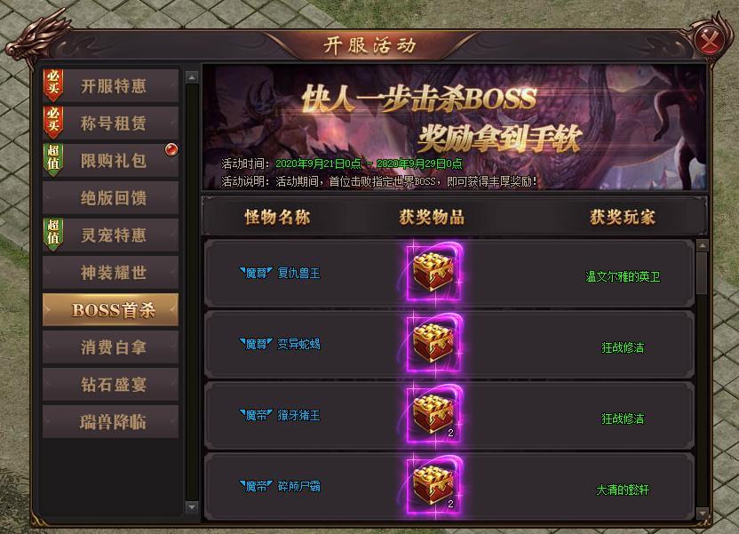活动说明:活动期间,首位击败指定世界BOSS,即可获得丰厚奖励!