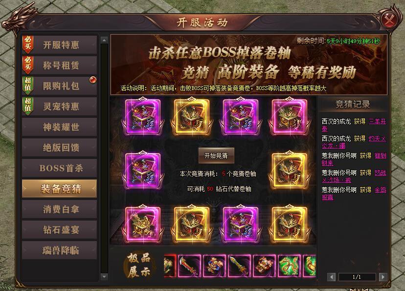 活动说明:活动期间,击败BOSS可掉落装备竞猜卷,BOSS等阶越高掉落概率越大,消耗装备竞猜卷,可竞猜高阶装备等稀有奖励!