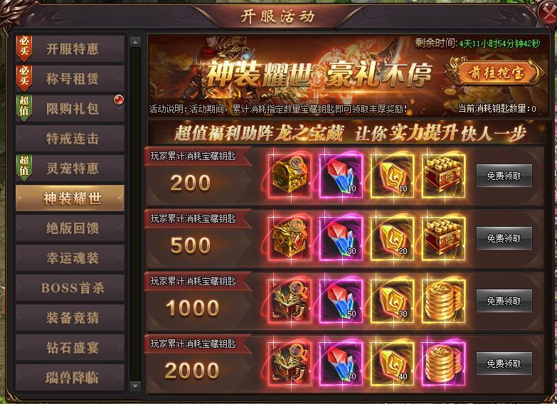 活动说明:活动期间,玩家累计消耗宝藏钥匙达到指定数量,即可额外领取高阶战装、神装自选箱奖励!