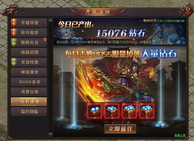 活动说明:活动期间,击杀任意BOSS即可掉落钻石,更有大额钻石限量掉落,时间就是钻石,绝对不可错过!