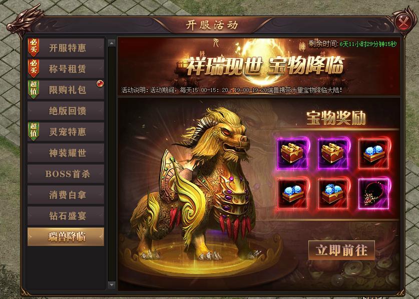 活动说明:活动期间,每天15:00、19:00,瑞兽携带大量宝物降临,参加击杀即可获得极品奖励!