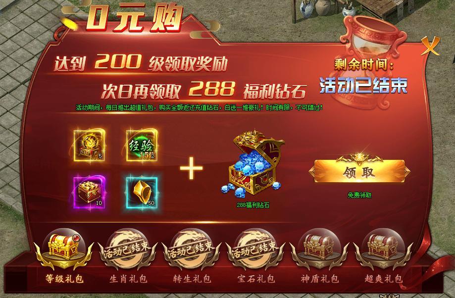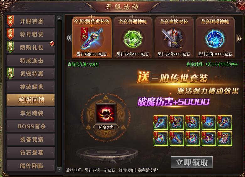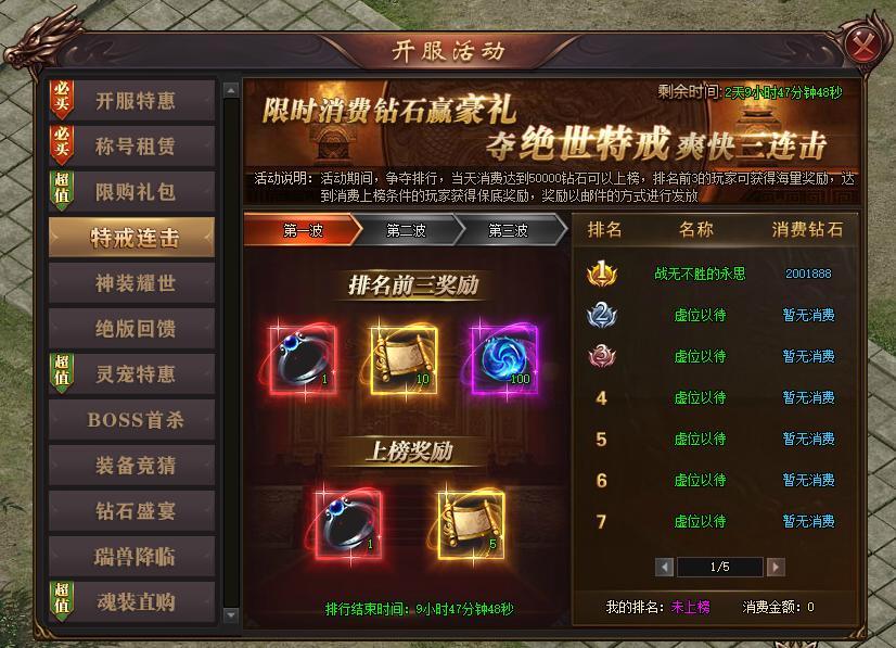 活动说明:活动期间,每天消费钻石达到50000钻石,在当天活动结束时即可获得麻痹、复活、护身特戒及稀有材料奖励!