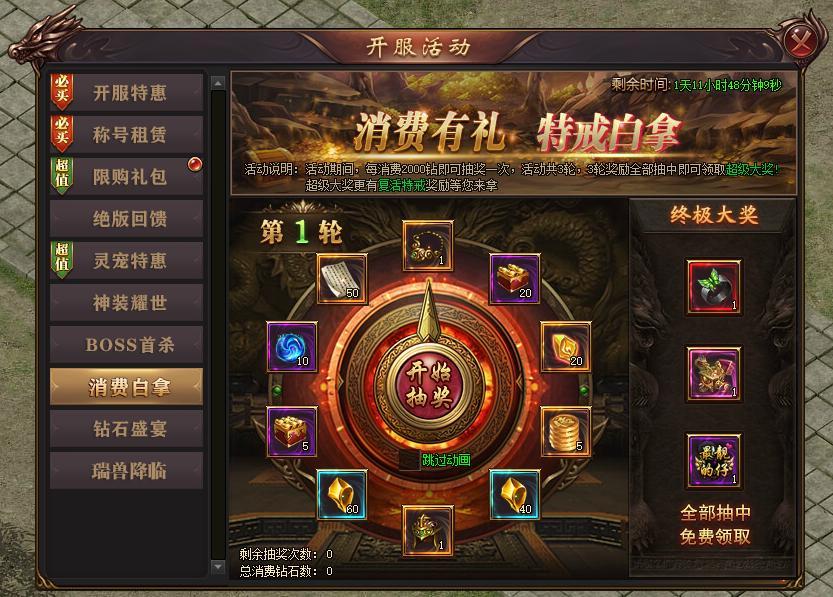 活动说明:活动期间,每消费2000钻石即可抽奖,每轮奖励全部抽中即可领取超级大奖!炫酷称号,复活特戒等你来拿!