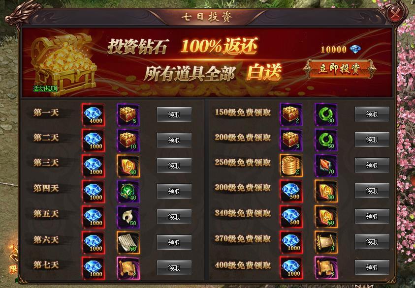 活动说明:活动期间,投资钻石后,钻石100%返还,所有道具全部白送!