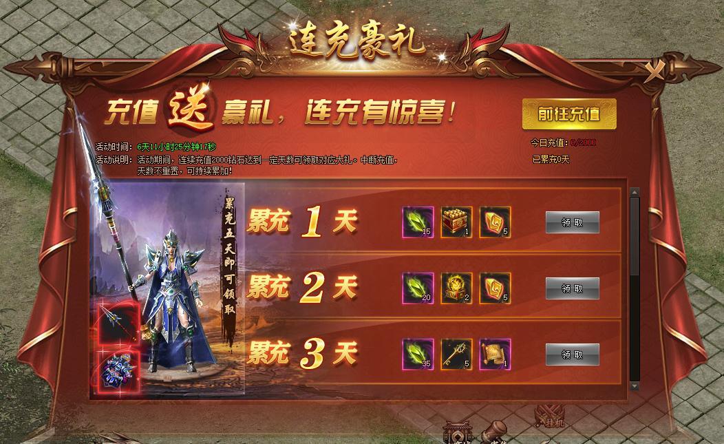 活动说明:活动期间,连续充值2000钻石达到一定天数即可领取对应大礼。中断充值,天数不重置,累充5天更有绝版时装奖励!