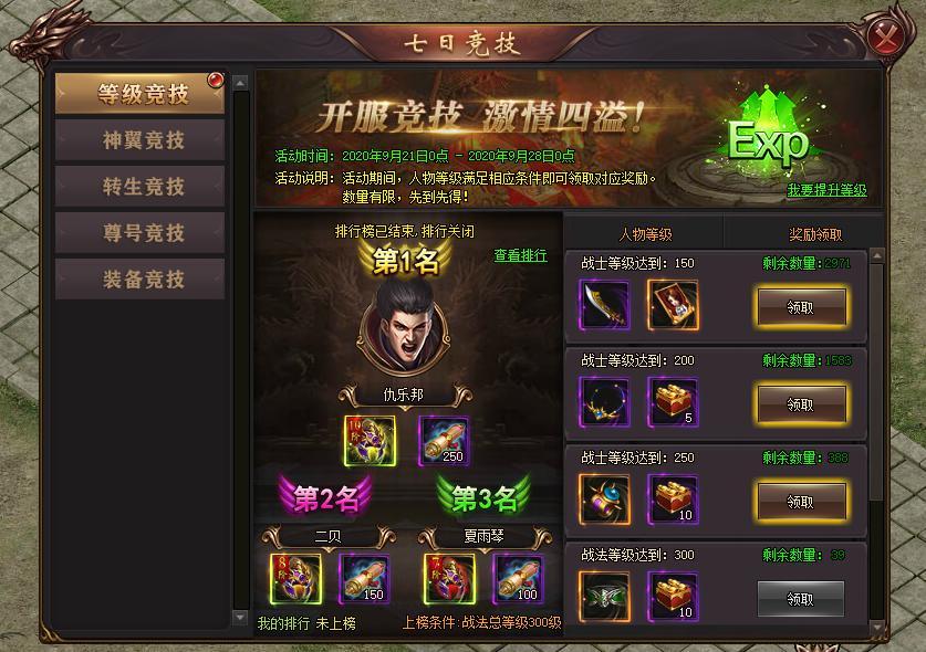 活动说明:活动期间,人物总等级满足相应条件即可领取对应奖励,数量有限,当天排名前3更可获得高阶传世装备奖励!