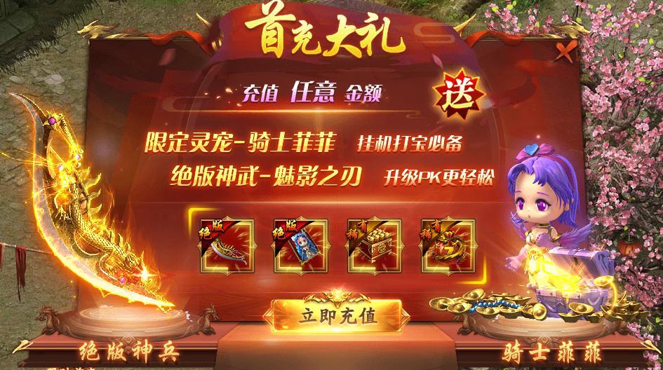 活动说明:充值任意金额,可获得限定灵宠、绝版神武,更有海量元宝和稀有道具相送!