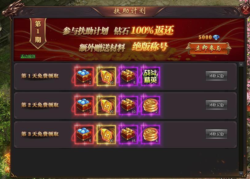 活动说明:参与扶助计划,钻石100%返还,额外赠送大量材料,更有绝版称号相送!