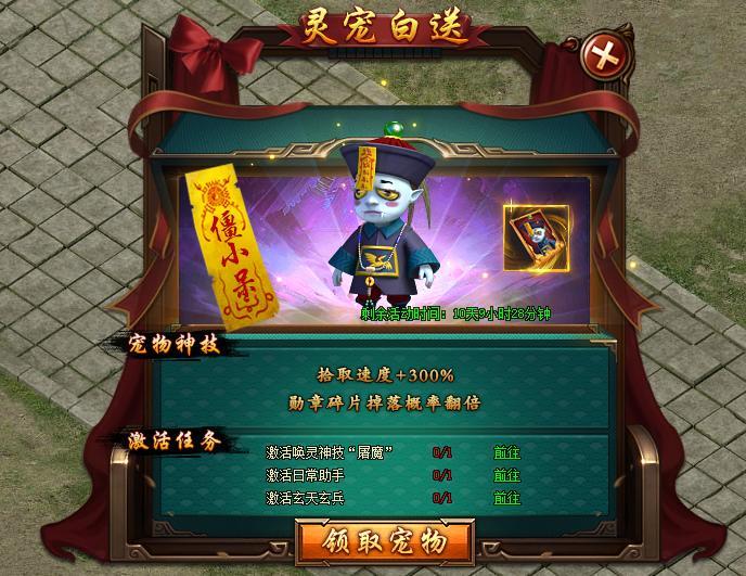 活动说明:活动期间,达成目标即可免费领取特殊灵宠,可光速拾取掉落道具、且使勋章碎片掉落概率翻倍,前期打怪效率、成长速度快人一等!