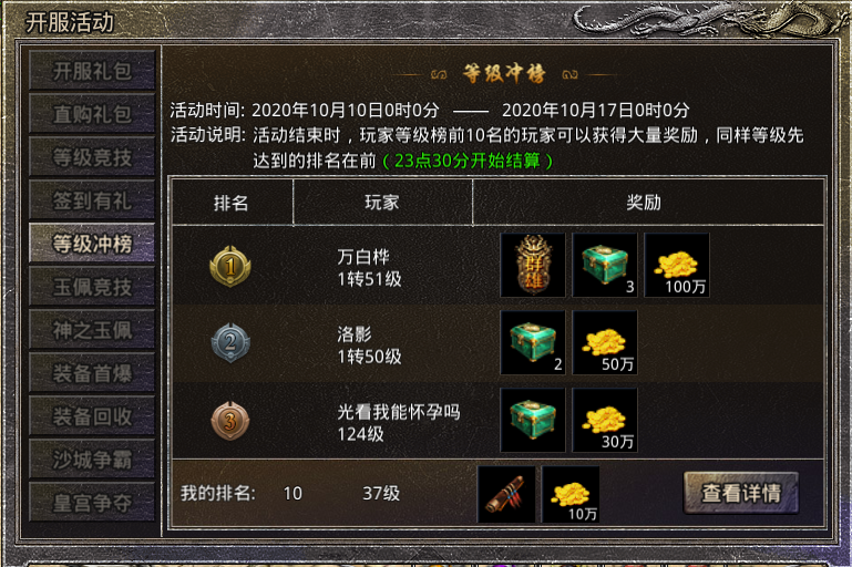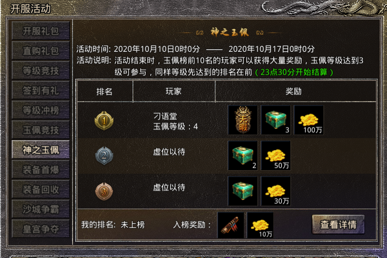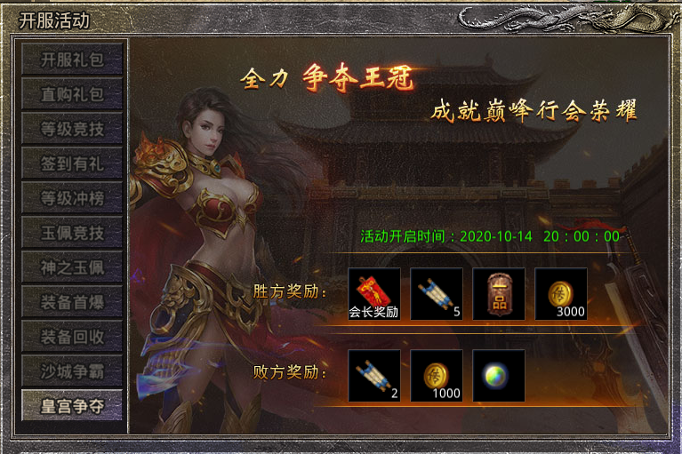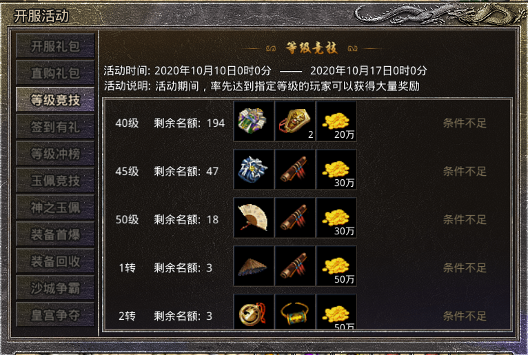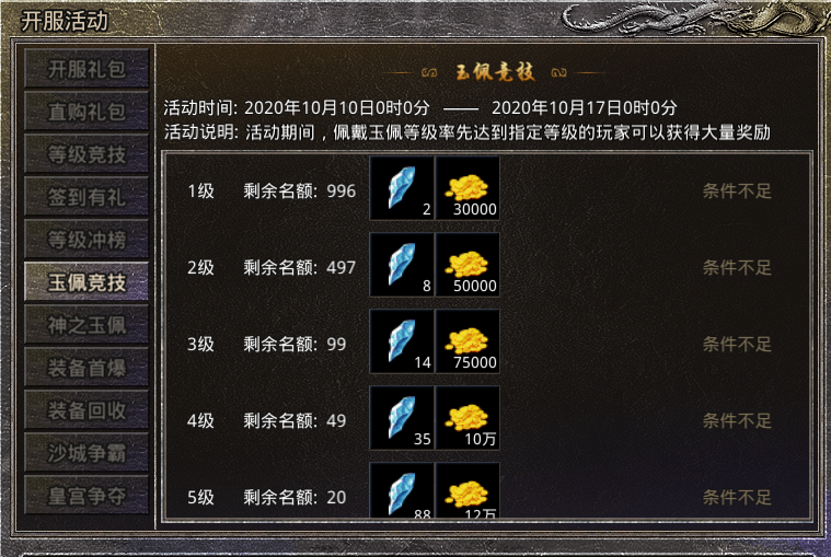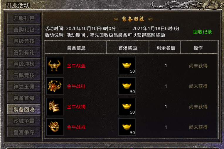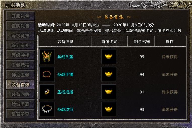【活动标题】开服活动(活动内容以游戏中实际内容为准)一、开服礼包二、直购礼包 三、等级竞技四、等级冲榜五、玉佩竞技六、神之玉佩七、装备首爆八、装备回收九、沙城争霸十、皇宫争夺注:本次活动的解释权最终归《原始传奇》运营团队所有