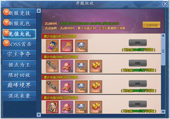 活动期间,充值元宝数量达到指定数额时,即可领取累充反馈奖励。