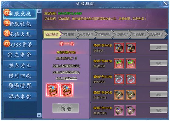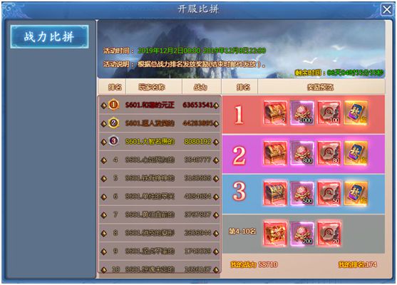开服前三天,根据玩家的总战力进行排名,领取限定称号和红色装备。