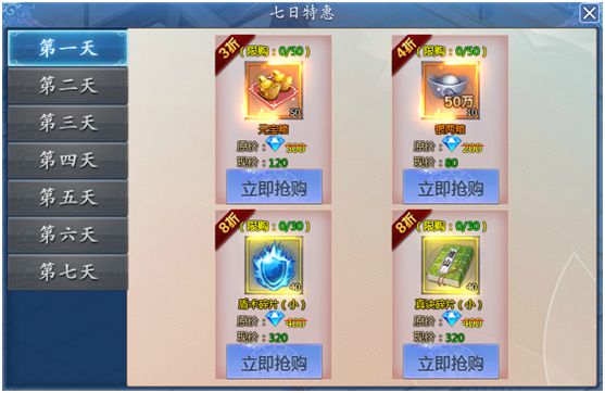 开服七天每天都可以用折扣价购买指定的道具。