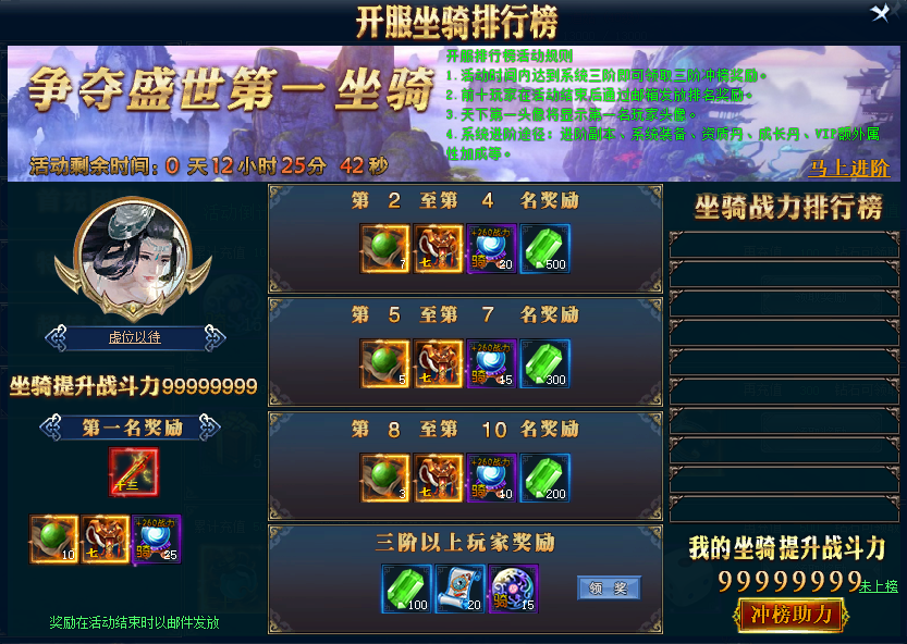 【活动内容】活动时间内对应战力达到系统三阶即可活动冲榜奖励,活动结束后,第1至10名更有额外奖励。