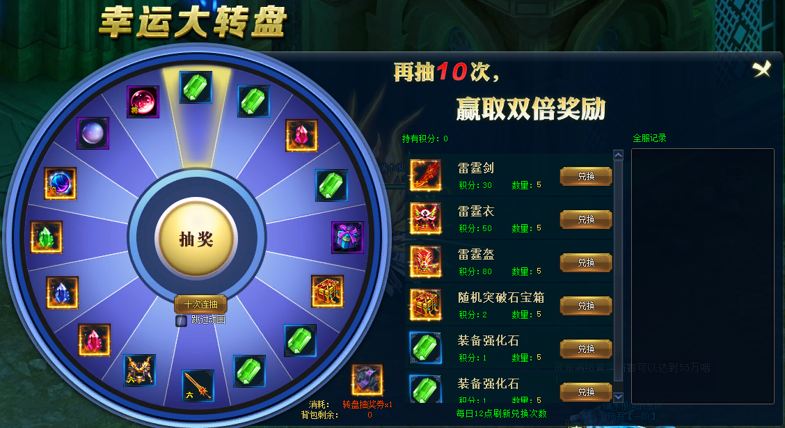 【活动内容】使用转盘抽奖券抽取顶级好礼,兑换神装奖励,每抽取10次还能赢取双倍奖励
