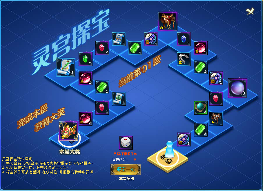 【活动内容】每天1次机会移动棋子获得指定格子奖励,每完成一层必定获得重点大奖。