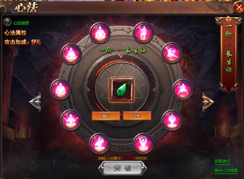 心法等级每提升10重,就可以升阶,还能获得一次激活心法法石栏位的机会。激活法石栏位童谣需要消耗心法精华,激活后可以装备法石。